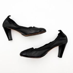 Chanel CC Logo Cap Toe Elastic Pumps Black Leather Heels EU 41.5