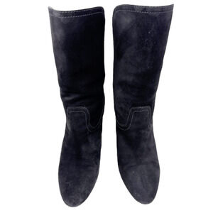 AUTHENTIC Chanel CC Logo Embroidered Black Suede Calfskin Warm Grey Tweed Tall Mid Calf Pointed Toe Heeled Ankle Boots Winter Shoes