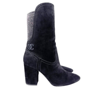 Chanel CC Logo Embroidered Black Suede Grey Tweed Mid Calf Heeled Ankle Boots