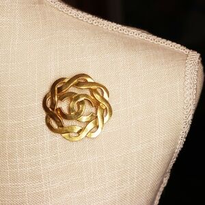 Chanel CC Logo Gold Plated Swirl Brooch with Box ~ Made In France *signed*