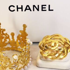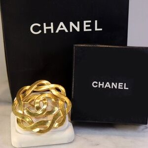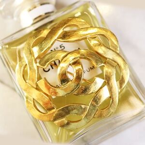 Chanel CC Logo Gold Plated Swirl Brooch with Box ~ Made In France *signed*