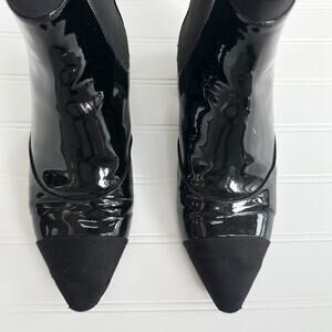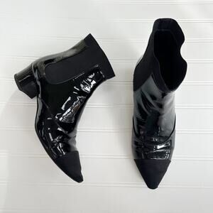 Chanel CC Logo Patent Leather Chelsea Ankle Boots Black Pointed Cap Toe 36.6
