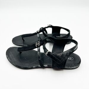 Chanel CC Logo Sandals Black Suede and Calf Hair Metallic Flats Size Eu 39 US 8-