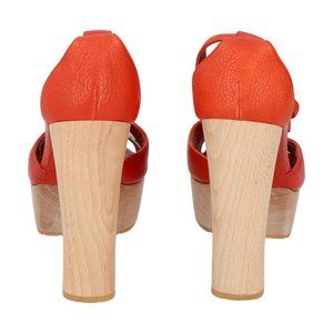 Chanel calfskin Wooden CC Sandals 38.5 in Burnt Orange. Chanel sandals designed with a silver toned 'CC' logo front and crafted with a grained burnt orange leather. Features an adjustable buckle ankle strap and wooden heel with rubber sole They are peep toe and feature a 5 in wooden heel with silver CC logo hardware. Comes with shoes dustbags.