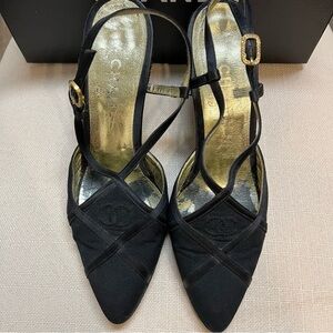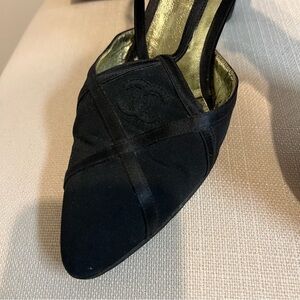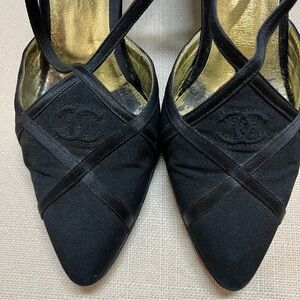 Chanel CC Logo Vintage Black Satin Cap Toe Slingback Heels Pumps Leather Size 8