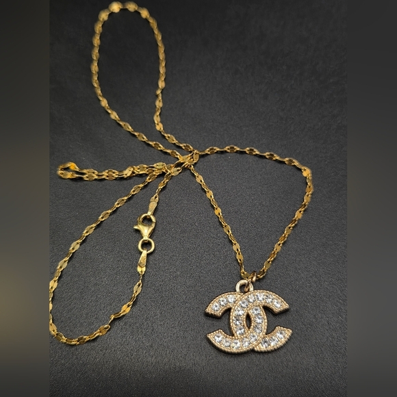 This stunning Chanel CC-pendant necklace features a crystal-accented double-C design paired with a 20-inch gold-over-S925 sterling silver chain. A timeless, statement piece that adds instant luxury to any outfit.