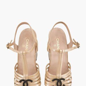 These Chanel wedge sandals in beige champagne leather blend retro glam with iconic Chanel elegance. The multi-strap upper in pearlescent patent leather shimmers softly in the light, while the subtle CC logo accent adds a touch of signature branding. Designed with an open round toe and a secure ankle strap with buckle closure, these wedges offer a flattering and supportive fit. The sculptural high block wedge heel and platform provide dramatic lift with added stability. Finished with a leather footbed, lining, and outsole, these sandals are perfect for garden parties, rooftop events, summer weddings, or adding polish to resort-ready looks. Comes with the original box and two dust bags.