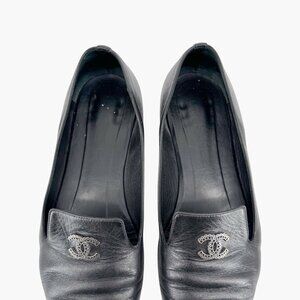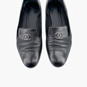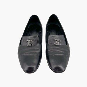 Chanel CC Smoking Loafer Flats Black Leather Size 37.5 US 6.5–7 Women Slip On