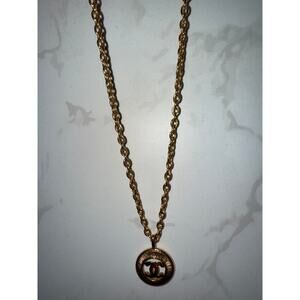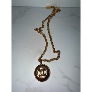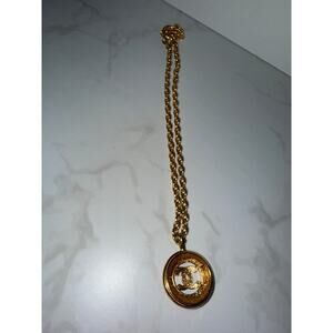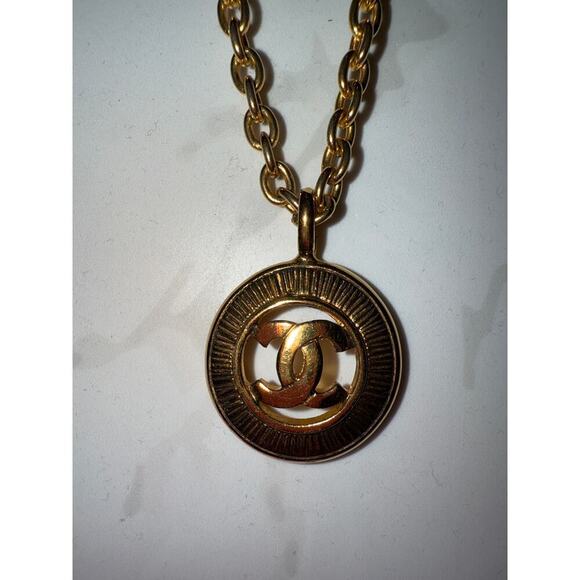 Classic Chanel necklace featuring a round pendant with iconic CC logo surrounded by a sunburst pattern. Chunky gold-tone chain with authentic Chanel tag. An elegant vintage piece perfect for any Chanel collection.