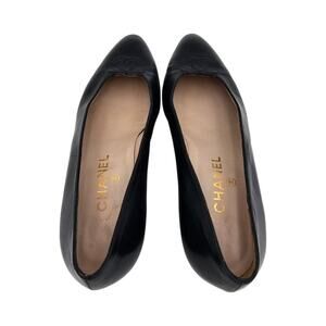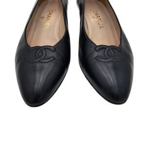 Chanel CC pumps, vintage Chanel heels, black leather kitten heel, Chanel pointed toe shoes, Chanel logo heels, classic designer heels, authentic Chanel shoes, luxury women’s heels, elegant black pumps, Chanel size 37.5, Chanel US 6.5, designer work shoes, Parisian chic pumps, Chanel embossed CC shoes, pre-owned Chanel heels, timeless Chanel footwear, collectible Chanel shoes, luxury vintage pumps