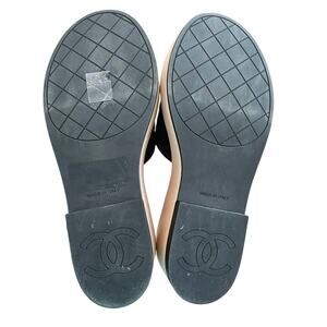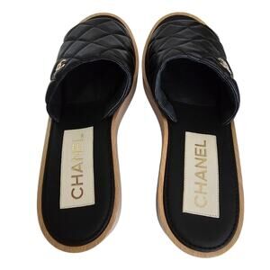 Chanel sandals, Chanel platform slides, Chanel quilted leather mules, Chanel CC logo shoes, Chanel black wedge sandals, authentic Chanel sandals size 39, luxury designer slides, Chanel pre-owned shoes, Chanel wood platform mule, designer summer sandals