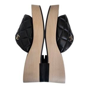 Chanel CC Wood Platform Sandal Slide Mule Size 39 US 8 8.5 Quilted Black Leather