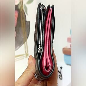 Chanel wallet with vibrant pink interior. Features iconic logo detail. Compact and chic.