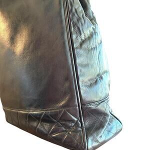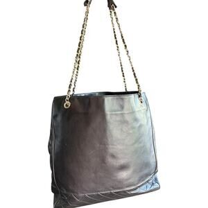 This is a classic Chanel Cambon Ligne Tote in black leather with the signature chain and leather straps. It has the quilted detail at the bottom and is super roomy for everyday use. Leather interior. Some gentle wear but still looks amazing! Perfect for anyone who loves timeless designer bags.