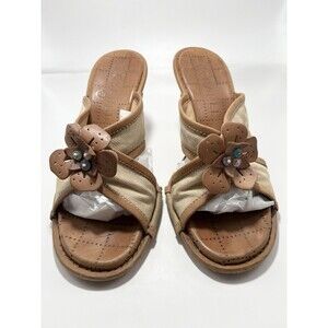 Chanel Camelia Heel Sandals Tan Fabric Leather w/ Blue Bead Accents Y2K Sz 37 7