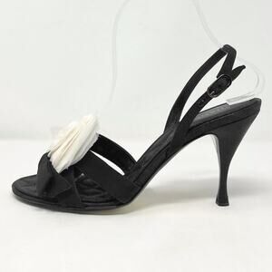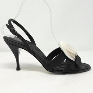 Keywords: Chanel camellia heels, flower heels, black slingback sandals, dressy party heels, wedding/bridal shower shoes, cocktail heels, vintage Chanel 2006, stiletto 85mm, size 38, Karl Lagerfeld, Archival Chanel, Y2K Chanel shoes, Retro Chanel, old money aesthetic, preppy, classic, feminine.