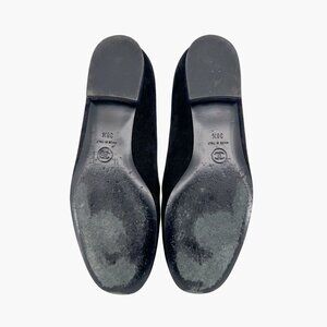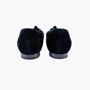 These Chanel ballet flats feature black suede uppers with tonal camellia flower appliqués, CC logo accents, and a rounded toe. The slip-on silhouette and leather lining make them ideal for polished everyday wear or low-profile luxury styling.