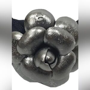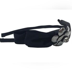 Chanel black silk headband with bow and pewter tone metallic camellia featuring interlocking CC at top. From the Spring 2012 collection. Excellent condition. Small rubbed area at one tip end. Does not affect use.