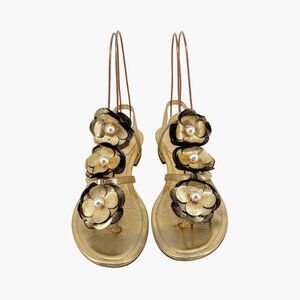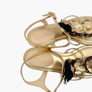 Chanel Camellia Pearl T-Strap Sandals Gold Leather Size 37C US 6–6.5 Women Flat