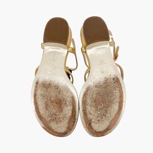 Shoes show signs of use, including creasing, scuffing of leather uppers (at toes, straps, and edges of heels), wear/discoloration on footbeds, and wear on outsoles. Area on right outer strap where metallic gold has peeled off of leather.
