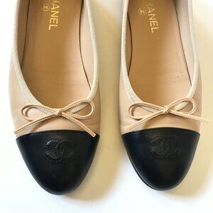 Women's Chanel Cap Toe Ballet Flats Shoes in a size 42. Stitched CC logo and bow detail coupled with the black and nude colors make these a timeless addition to any closet. Fast Same Day Shipping.