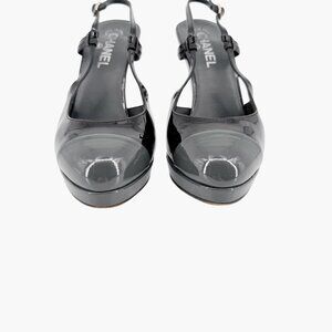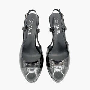 A sophisticated wardrobe staple, these Chanel slingback pumps seamlessly blend classic elegance with a modern edge. The glossy black patent leather upper is contrasted by a gray patent almond cap toe, delivering an effortlessly chic two-tone design. The slingback strap with buckle closure ensures a secure and adjustable fit, while the low platform and high cutout block heel provide both height and comfort. Perfect for office wear, evening events, weddings, or effortlessly elevating casual outfits with a polished finish.