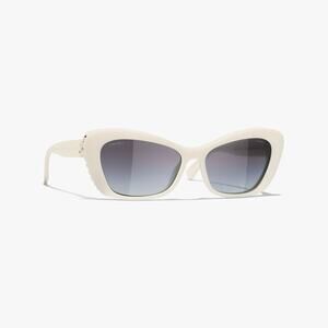 Featuring a cat-eye frame, gradient gray lenses, and pearl detail. Provides 100% UVA/UVB protection with CE standard UV Category 3 filter. Can be adjusted to prescription. Made in Italy. Material: Acetate and glass pearl. Color: White. Lens: Gray gradient