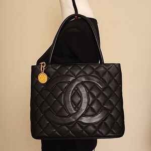 Chanel Caviar Gold Plated Medallion Tote Shoulder Bag Classic Black