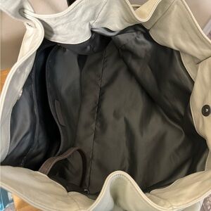 SN: 12134617’ Off White Large Satchel/Shoulder Bag; Exterior in very good condition with minimal marks; Some wear to adjustable strap holes. Drawstring and Snap closure; Interior in Good condition, no smell