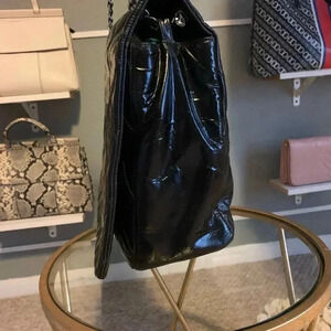 Authentic Chanel Chain CC Full Flap Bag quilted patent leather large in good condition outside patent leather no cracks or peeling except for the back packet looks like the color is little faded inside make up stains no box or dust bag.