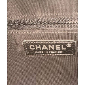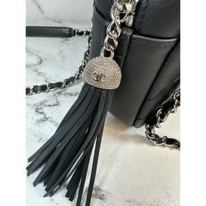 • Interlocking CC logo, diagonal chevron pattern, silver hardware, chain-link shoulder straps, tassel accent, lined with inner pocket, back pocket, and zip closure at top.
