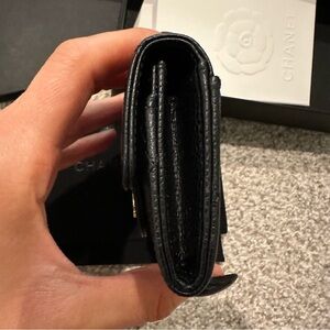 Gorgeous Chanel wallet in excellent condition. No flaws to note. I only used this one time. Includes all original packaging with box, bag, pouch, ribbon, & camellia. I also have original receipt. This is chipped, so there’s no interior number. Pet-free, smoke-free home.