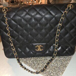 The handbag is a Chanel Classic Flap bag (specifically the Jumbo or Maxi size) in black quilted caviar leather with gold-tone hardware.