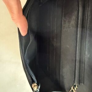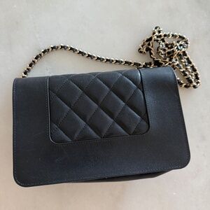 Chanel Classic Quilted Wallet-on-Chain. Fair condition, visible wear, specifically, the bottom of the wallet extends down on one side (see video). Some discoloration inside (see video).