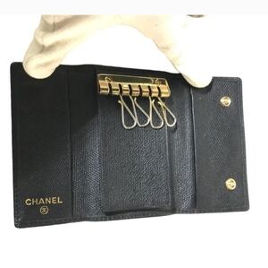 Chanel Coco Button black caviar leather key holder. Features a convenient snap-lock closure with the iconic Coco button. Inside, multiple key hooks keep your keys organized and easily accessible, also has two pockets that could be used for ID or credit cards. Excellent used condition.