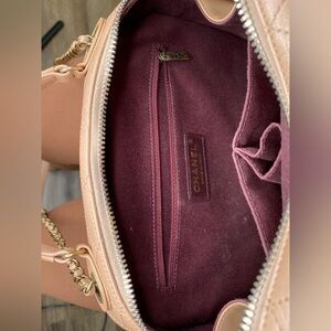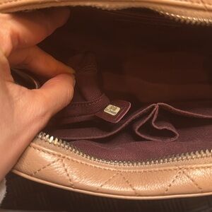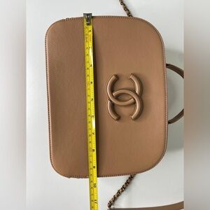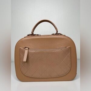 Rare Chanel Coco Curve Vanity in shiny calfskin & goatskin with tone-on-tone embossed CC. Top handle + leather-through-chain crossbody strap, zip-around closure, and rear diamond-quilted zip pocket—elegant, structured, and surprisingly roomy.