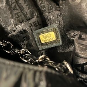 The bag is made of black vinyl,with silver-tone hardware, dual chain-link shoulder straps, stitched signature CC at front, tonal logo jacquard lining, three pockets at interior walls,one with zip closure and magnetic snap closure at top. Featured on this tote is a huge Chanel circular CC silver tone metal charm.