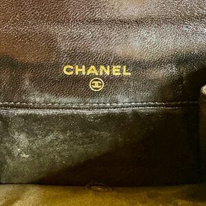 Chanel compact wallet Exterior black leather has clearcoat applied to eliminate future peeling Hologram intact Snap is good