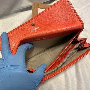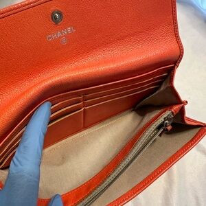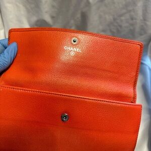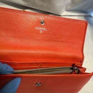 Chanel Coral Leather Camellia CC Flap long Wallet with box/cards/black cloth.