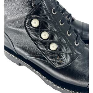 This is an authentic pair of CHANEL Crackled Calfskin Velvet Pearl Combat Short Boots size 38 in Black. These stylish lace-up boots are crafted of crackled black calfskin leather. They feature rounded black, smooth leather cap toes and a faux pearl snap closure with a quilted leather button flap and a chain-link leather threaded base trim.
