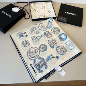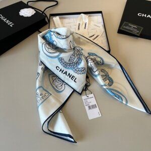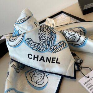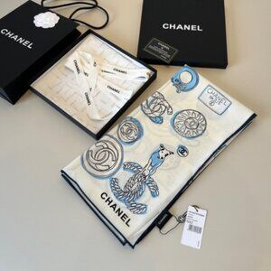 Discover the beauty of this Chanel cream base patterned scarf. The exquisite silk material is adorned with striking light blue designs and the celebrated CHANEL logo, ensuring a sophisticated and eye-catching appearance.