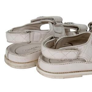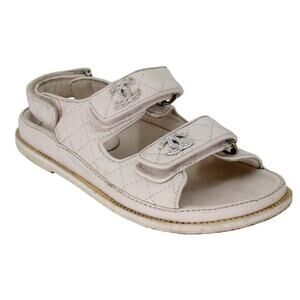 You'll truly be in utter love with these sandals from Chanel as they are stylish and modern. They've been crafted from leather and designed with their signature diamond shape pattern these have been sold out and extremely rare no longer available, velcro straps and the CC logos on the uppers. The sandals are just perfect to nail a chic casual look. The soles show wear from light use. The uppers show wear and creasing, but otherwise is in good condition. Now these white style are a complete must have!! you wont see another pair in this size.