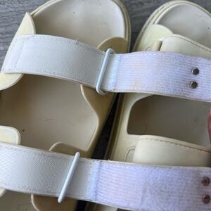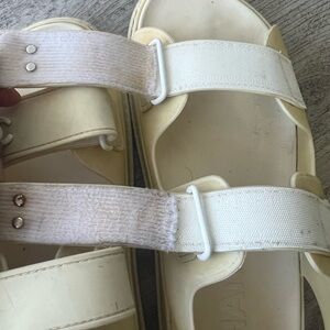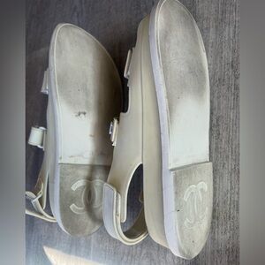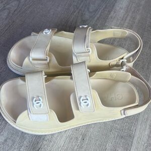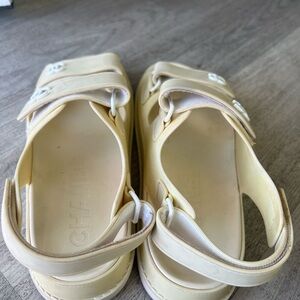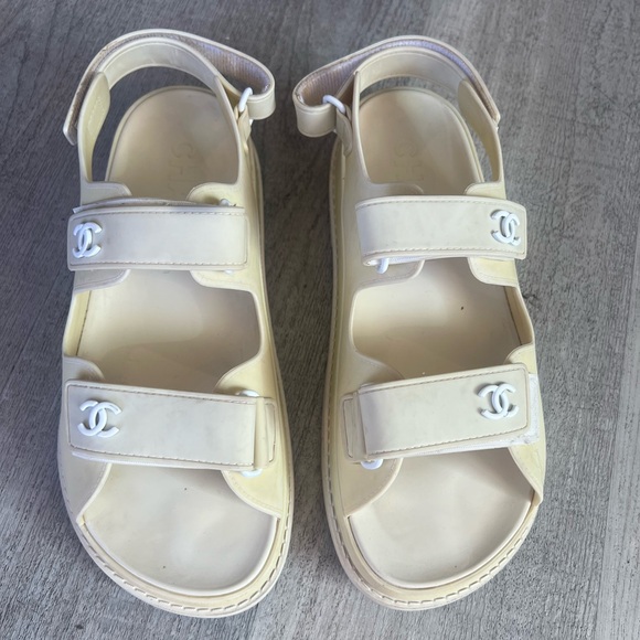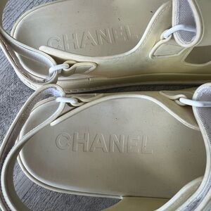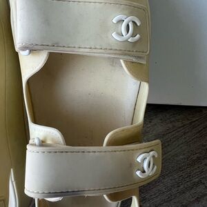 Elegant cream sandals with iconic CHANEL logo. Secure strap design for comfort and style.