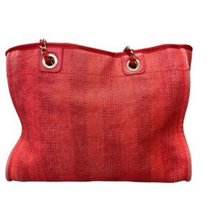 Condition: This Chanel Deauville Canvas and Leather Tote is in fair condition with natural wear on the raffia exterior, light fading on the sides and corners, and a little dirt inside along with a small pen mark on the bottom.