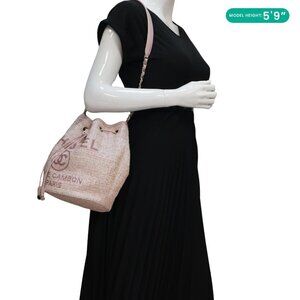 The Chanel Deauville Lurex Boucle Drawstring Bag in pink features a shiny, boucle fabric with a relaxed, bucket-bag silhouette. This chic bag has a drawstring closure and chain-link shoulder strap for effortless style.