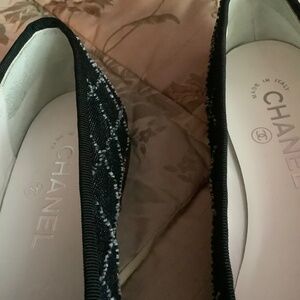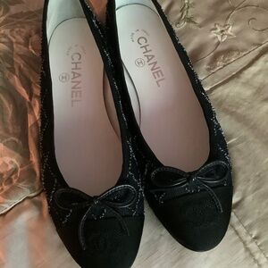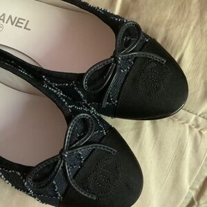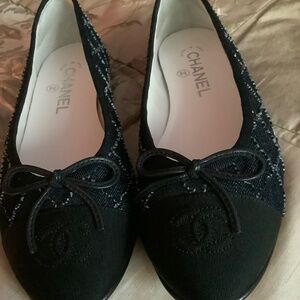 Chanel captoe quilted denim ballet flats in dark blue denim. Never worn. Bought on RR a few months ago but never wore them. They have a little bit of sticky residue on interior back ankle, looks like from heel pads that were initially put on. Comes with dust bags. Size 37. True to size, in my opinion. I like 36.5 or 37(preferred) in Chanel flats and these are a little loose on me.