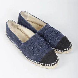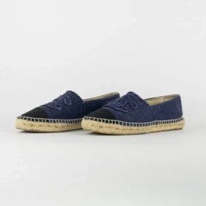 These Chanel espadrille flats have a natural fibrous textile midsole with a durable upper of toile denim in indigo blue with a black cap toe and a prominent CC logo patch. These are marvelous espadrilles for a more natural and casual timeless style only from Chanel!