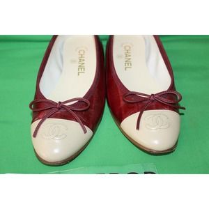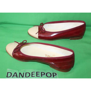 Chanel Ballet Flats Made In Italy Leather Burgundy And Beige With Logo. Women's Size 36.5 Which Is 6-6.5 Women's US Size. Sole is about 9.5" Long, minor spot mark inner side of one see photo. Minor wear, from one owner, Bottom has some scuff wear. Comes Strictly as seen with all seen in photos. Find this in my Shoes category