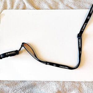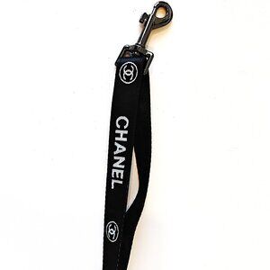 Chanel dog collar and matching leash set in black with white Chanel writing and logo.