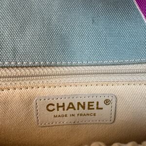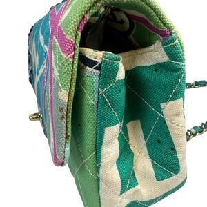 • This chic bag is crafted of multicolored quilted canvas, designed with a Parisian flair and a detailed sequin Eiffel Tower on the front flap. The hardware is gold tone which includes CC twist lock, chain, and canvas threaded straps. The interior has an ivory fabric lining with zipper and patch pockets.